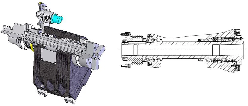 The machine tool Z axis adopts rectangular sliding guide rail pair, after medium frequency quenching, the hardness of guide rail surface ≥ hrc52, precision grinding, good durability and high rigidity. The base surface of the bed guide rail, the head box guide rail surface, the tailstock guide rail surface and the z-axis screw bearing seat installation surface constitute the important machining surface of the bed. In the design process of this part, the overall shape of the machine tool, ventilation and heat dissipation, collection of cooling water leakage, chip conveyor installation, machine tool lifting and other aspects are considered. X axis is line guideway structure.